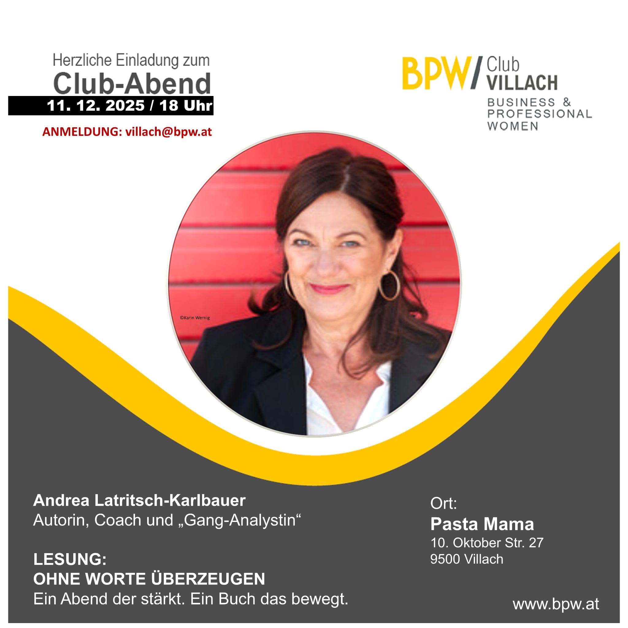 Interaktive LESUNG: OHNE WORTE ÜBERZEUGEN Ein Abend der stärkt. Ein Buch das bewegt. Unsere Vortragende: Andrea Latritsch-Karlbauer Autorin, Coach und „Gang-Analystin“ Programm: 11. Dezember [...] |