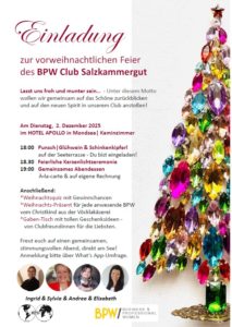 *Während und nach der Veranstaltung werden Fotos gemacht. Diese werden auf unserer Homepage www.bpw.at/salzkammergut veröffentlicht und sind als Nachlese und Erinnerung gedacht. Mit der Teilnahme erklärt ihr euch damit einverstanden.