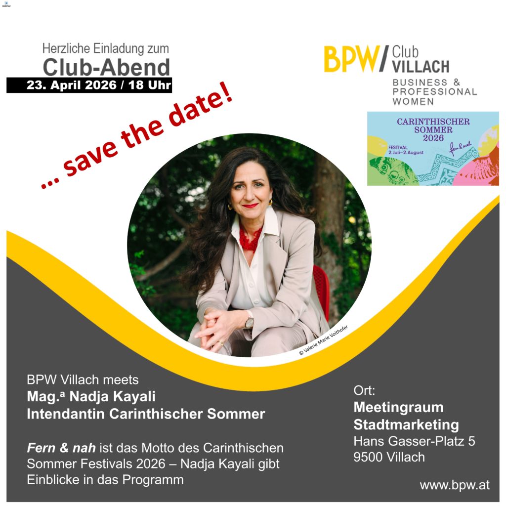 Auf der Veranstaltung werden Bilder und Videos gemacht. Die Teilnehmerinnen erklären sich ausdrücklich damit einverstanden, dass diese persönlichen Bilder der Wirtschaftskammer Kärnten und dem Business & Professional Women Club Villach für die Veröffentlichung auf Webseiten, Social Media und Printmedien verwendet werden dürfen.