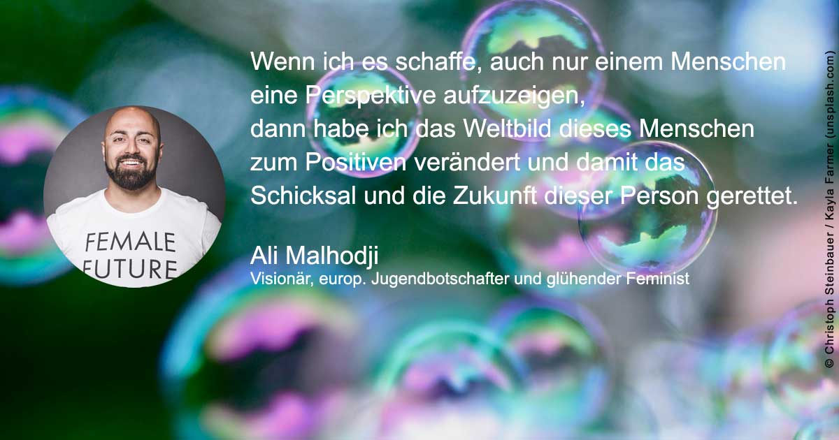Veränderungen prägten Ali Mahlodjis Leben, aber auch den Mut und den Willen sein Potential zu leben. Und ganz sicher wird er nicht stehen bleiben, sondern etwas Neues angehen und uns mit seinen Ideen verblüffen. Die Erkenntnis, dass man nur ein zufriedenes Leben führen kann, wenn man seine Potentiale lebt, prägt ihn und seine Vorträge. Dabei ist es gleichgültig, ob Frau, Mann, Behindert, Immigrant…