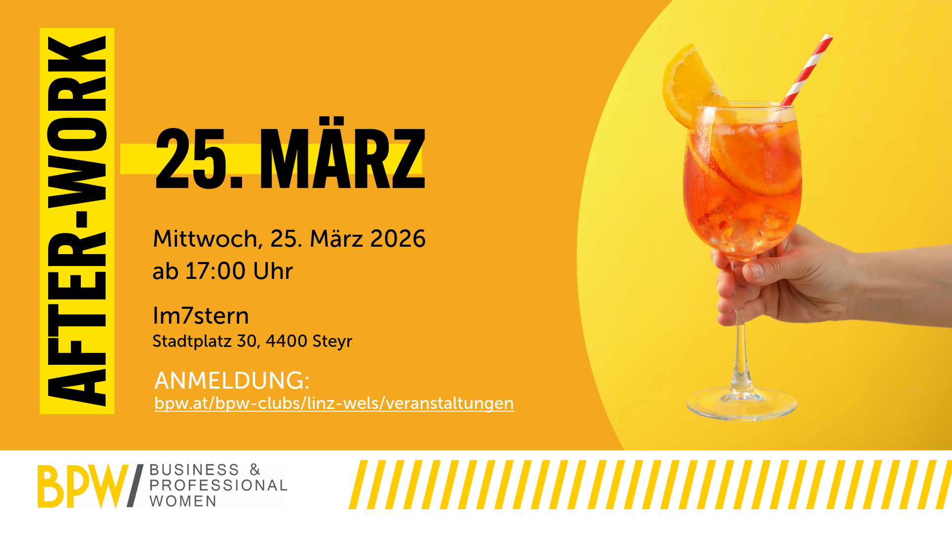 März 25 BPW Steyr After-Work-Drink im März 17:00 - 21:00 Im7Stern Stadtplatz 30, Steyr Veranstaltung Details Wegbeschreibung